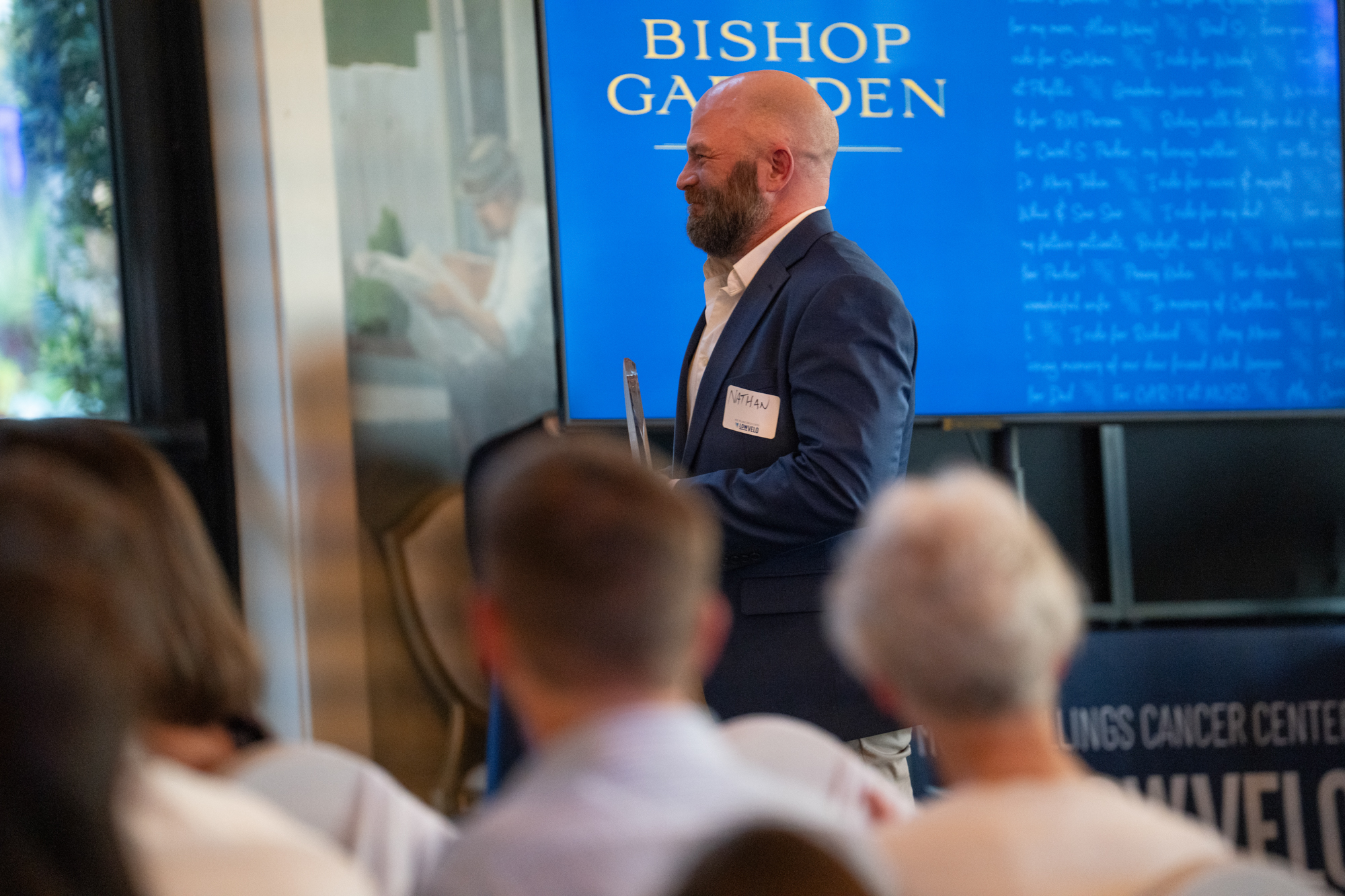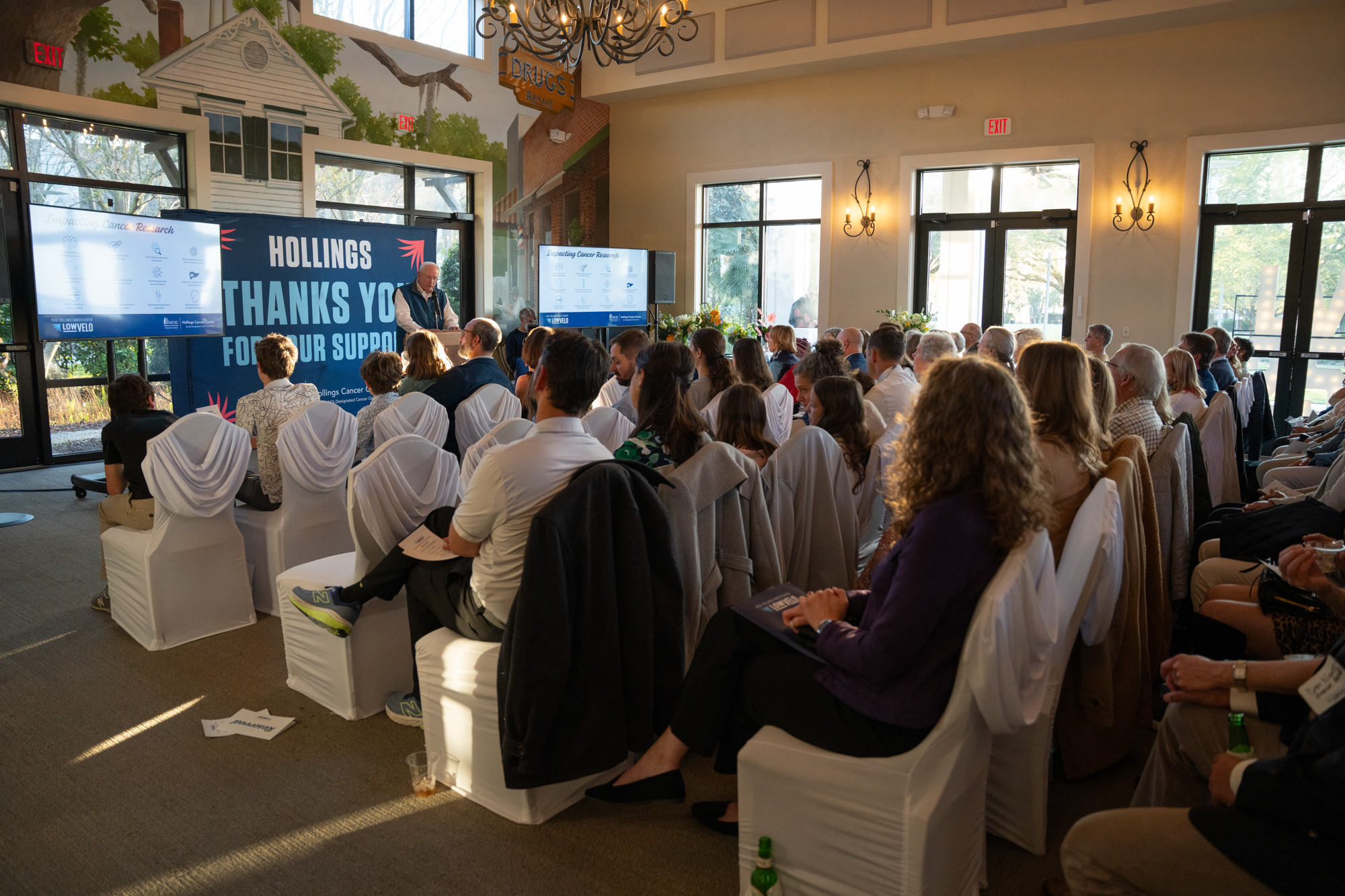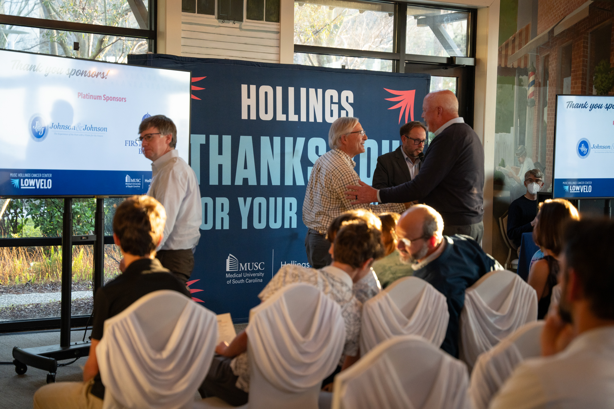 One special family took up the first three rows of seats as a video played to honor their patriarch, Marty Perlmutter. Perlmutter was one of the first patients at Hollings to receive CAR-T cell therapy, a groundbreaking immunotherapy that saw its first clinical trial at Hollings funded, in part, by LOWVELO riders.